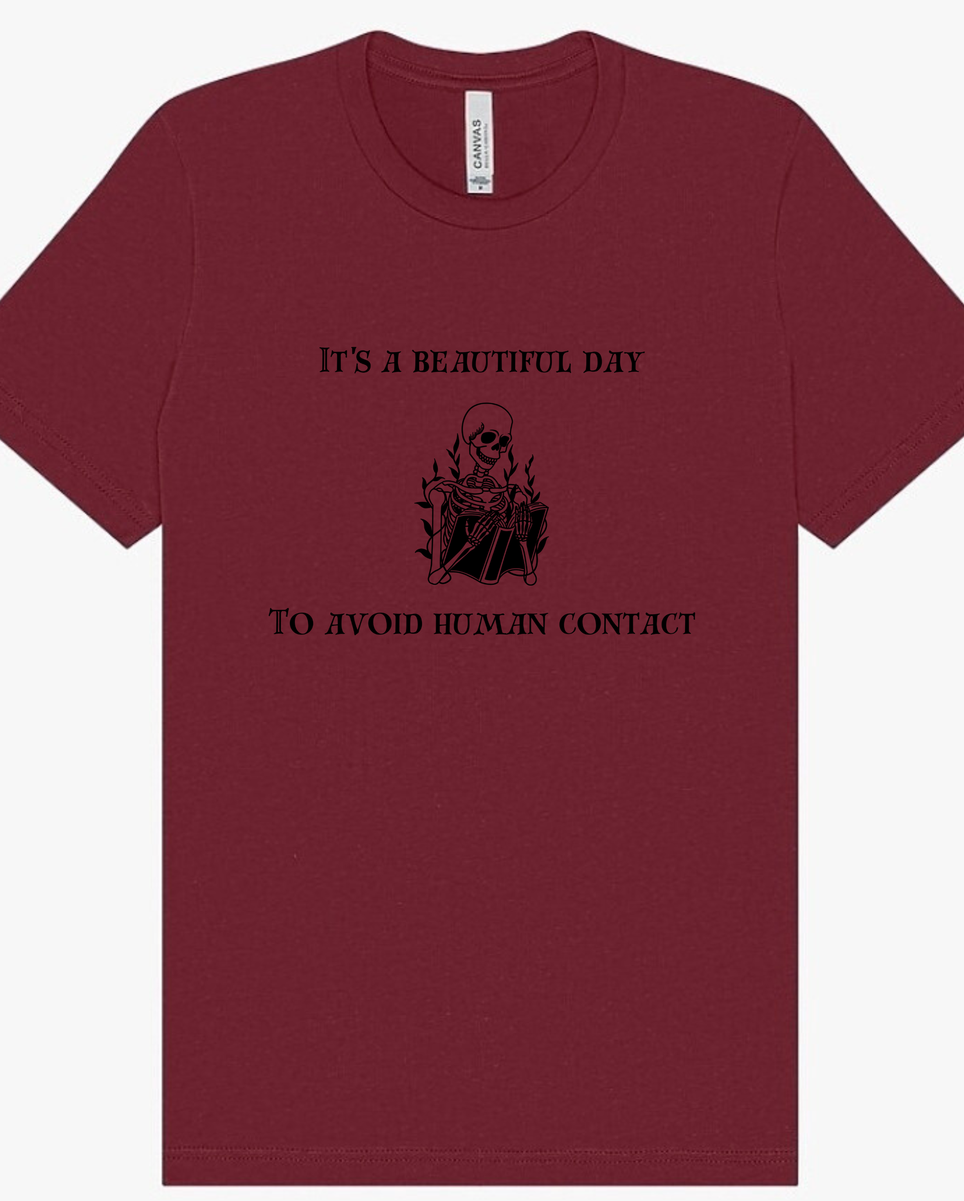 "It's a Beautiful Day to Avoid Human Contact" text with a skeleton reading a book graphic design screen printed unisex sweatshirt or tee. Printed on the incredibly soft Bella & Canvas Sponge Fleece Unisex crewneck or hoodie, or the Bella & Canvas Unisex Jersey Short Sleeve Tee with environmentally safe water-based ink. Sweaters available in sizes XS-3XL. Tees available in sizes XS-5XL. Designs on zip up will be printed on the back of the hoodie.