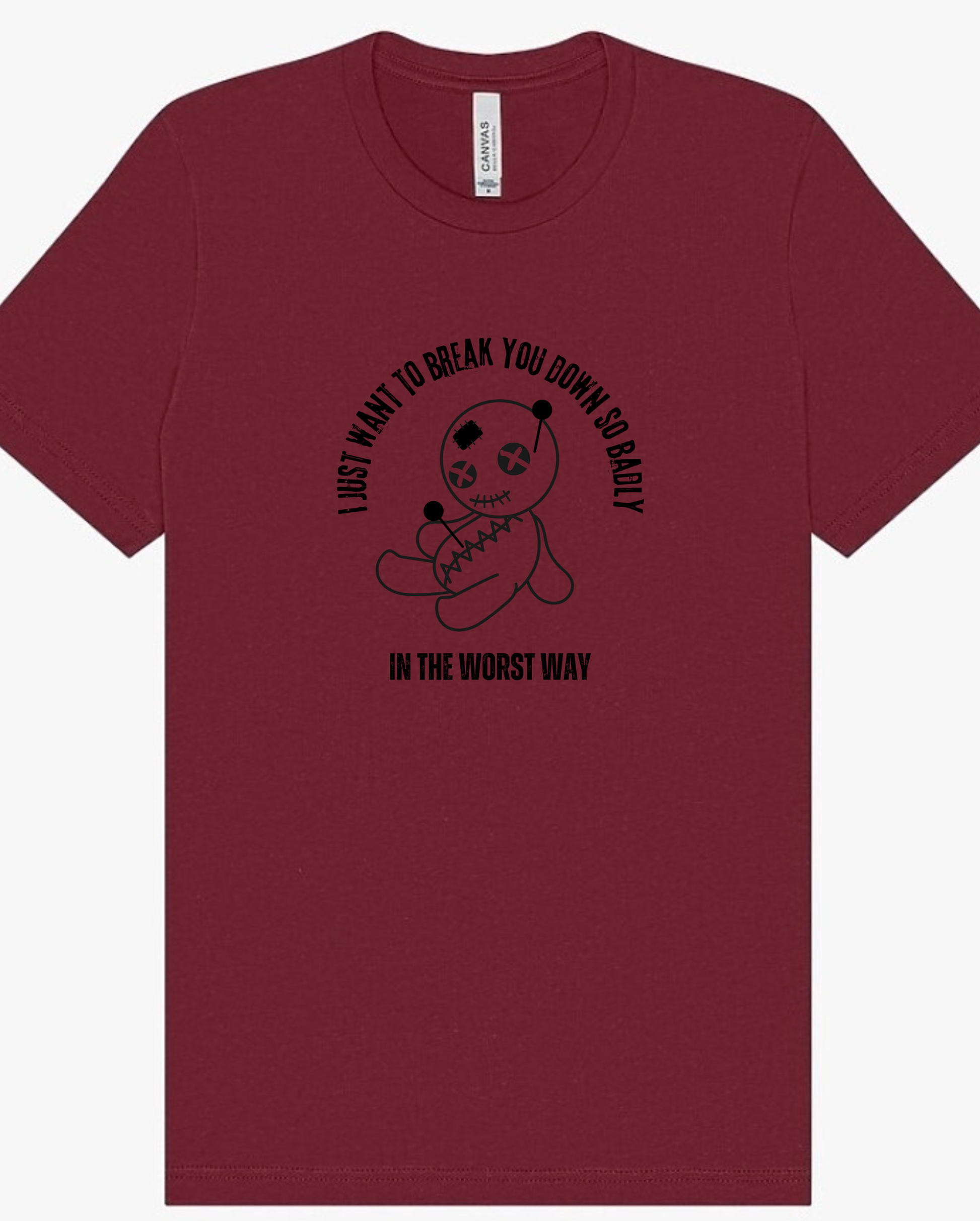 "I Just Want to Break You Down So Badly" text with voodoo doll graphic design screen printed unisex sweatshirt or tee. Printed on the incredibly soft Bella & Canvas Sponge Fleece Unisex crewneck or hoodie, or the Bella & Canvas Unisex Jersey Short Sleeve Tee with environmentally safe water-based ink. Sweaters available in sizes XS-3XL. Tees available in sizes XS-5XL. Designs on zip up will be printed on the back of the hoodie.