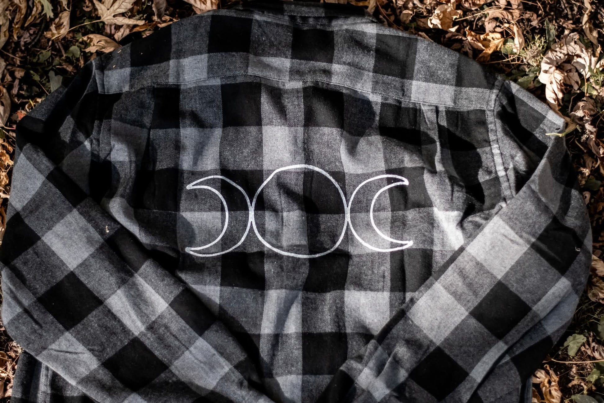 Triple Goddess moon symbol graphic design screen printed unisex sweatshirt or tee. Printed on the incredibly soft Bella & Canvas Sponge Fleece Unisex crewneck or hoodie, or the Bella & Canvas Unisex Jersey Short Sleeve Tee with environmentally safe water-based ink. Sweaters available in sizes XS-3XL. Tees available in sizes XS-5XL.