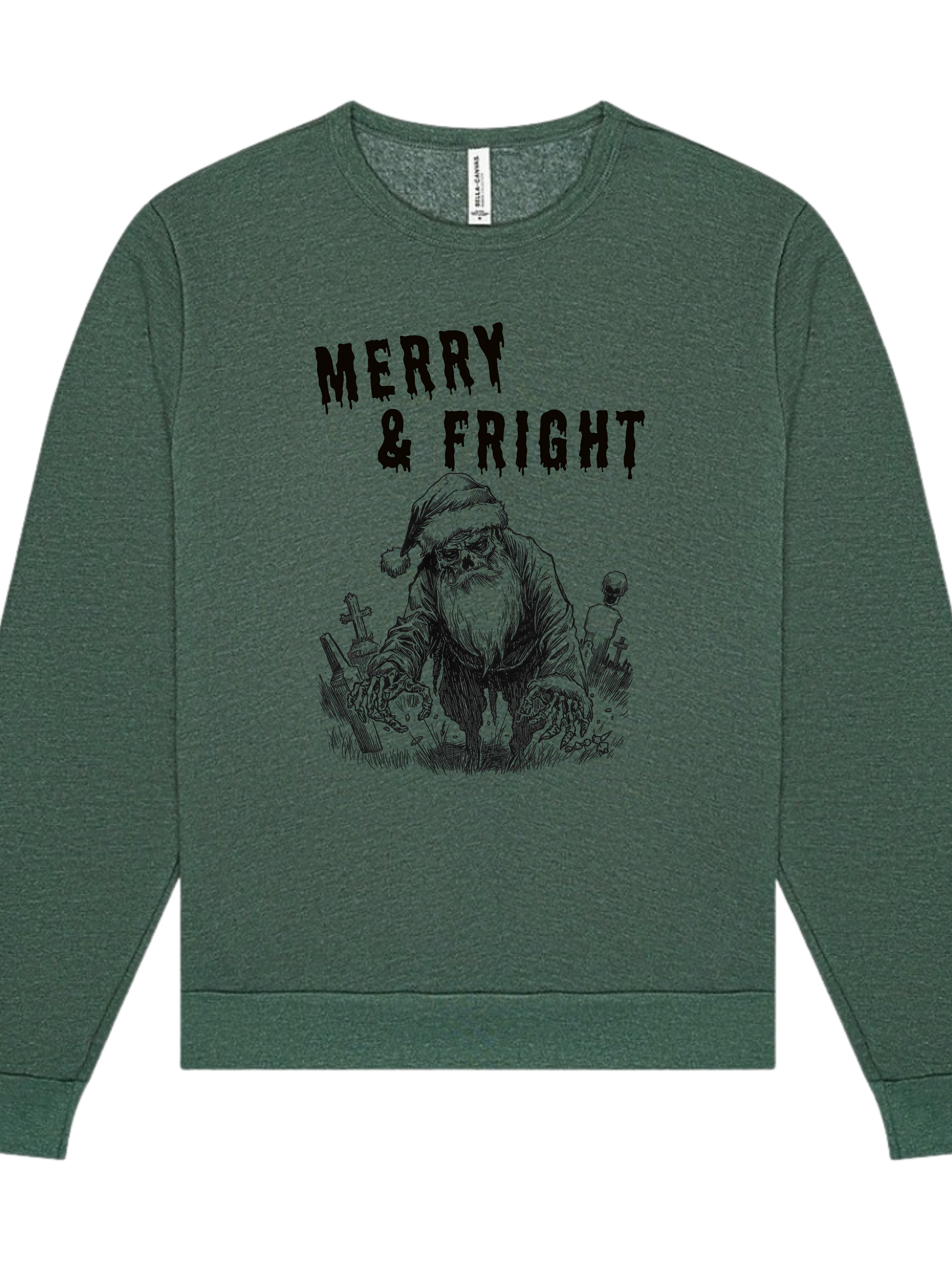 "Merry & Fright" text with zombie santa crawling out of a grave graphic design screen printed unisex sweatshirt. Printed on the incredibly soft Bella & Canvas Sponge Fleece Unisex crewneck or hoodie with environmentally safe water-based ink. Sweaters available in sizes XS-3XL.