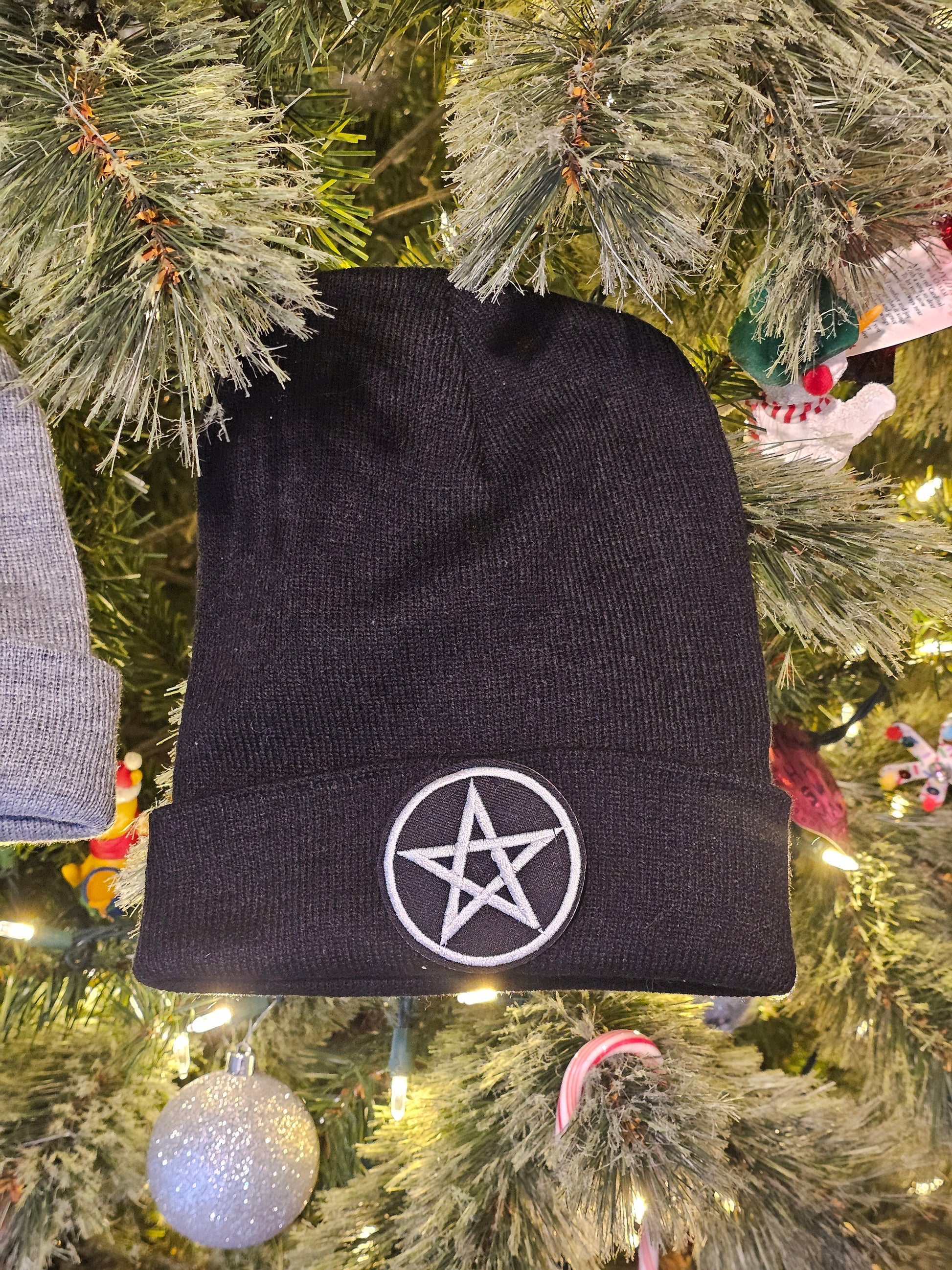 Beanie stocking hat featuring a black and white pentacle patch on the fold. Available in black and gray. One size fits most.