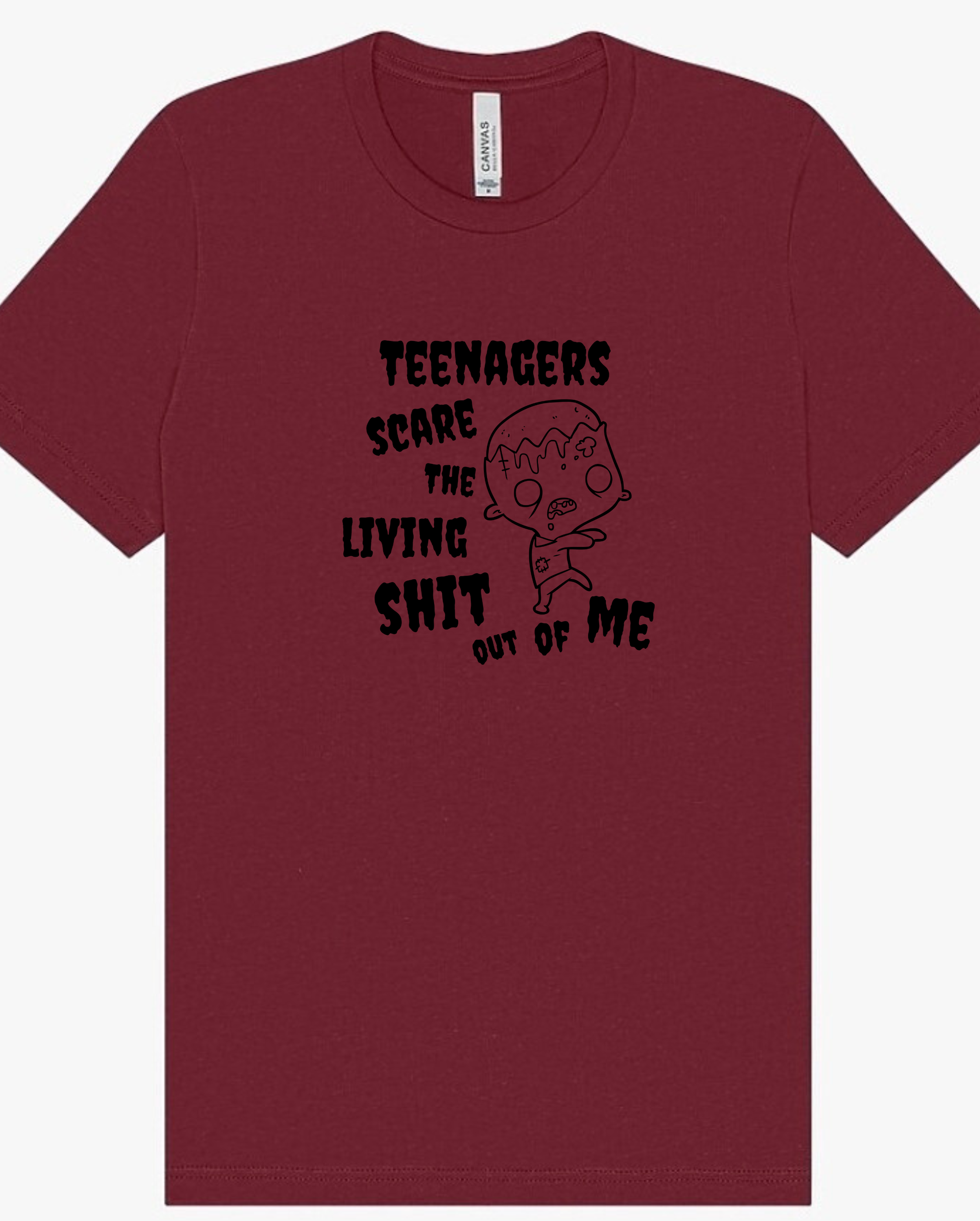 "Teenagers Scare the Living Shit Out of Me" text with zombie graphic design screen printed unisex sweatshirt or tee. Printed on the incredibly soft Bella & Canvas Sponge Fleece Unisex crewneck or hoodie, or the Bella & Canvas Unisex Jersey Short Sleeve Tee with environmentally safe water-based ink. Sweaters available in sizes XS-3XL. Tees available in sizes XS-5XL. Designs on zip up will be printed on the back of the hoodie.